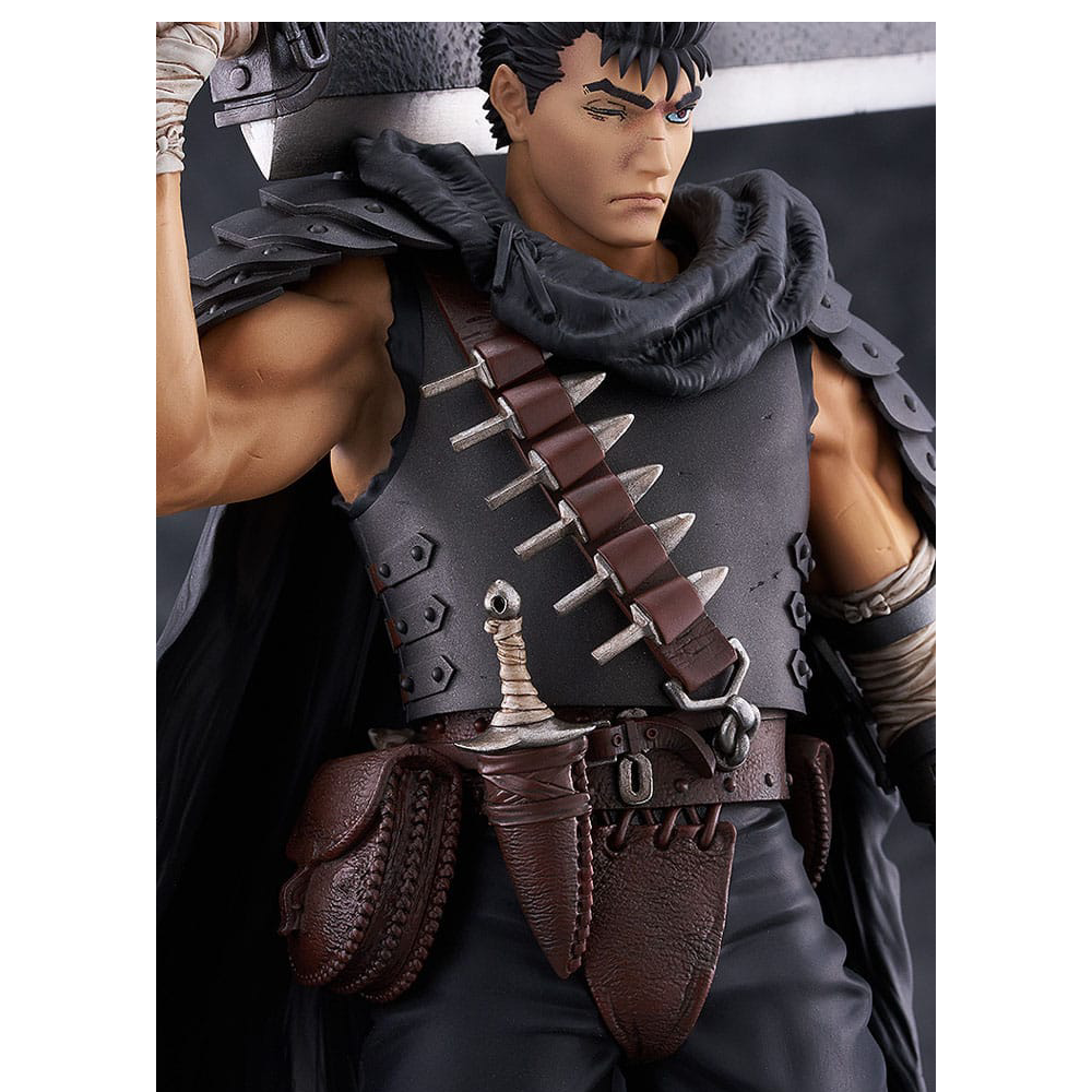 Die ca. 22 cm hohe PVC Guts Figur zeigt ihn in seiner schweren Rüstung, das mächtige Dragon Slayer-Schwert über der Schulter. Die detailverliebte Modellierung bringt jede Schramme und jede Niete seiner Panzerung zur Geltung, während sein entschlossener Blick den unerschütterlichen Willen des Kriegers einfängt.