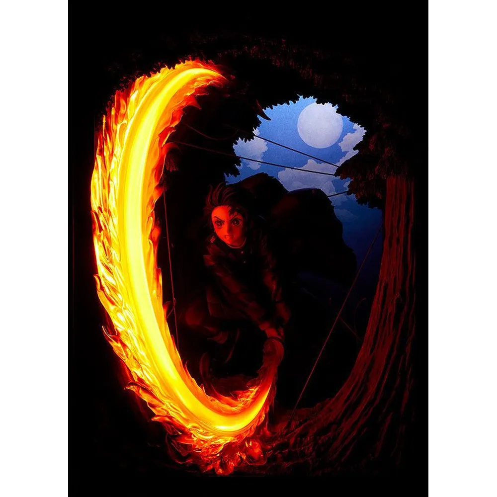 Die dynamische Pose, die fließenden Flammen-Effekte und die präzise Modellierung des Hanafuda-Ohrschmucks bringen Tanjiros Entschlossenheit und emotionale Stärke perfekt zur Geltung.